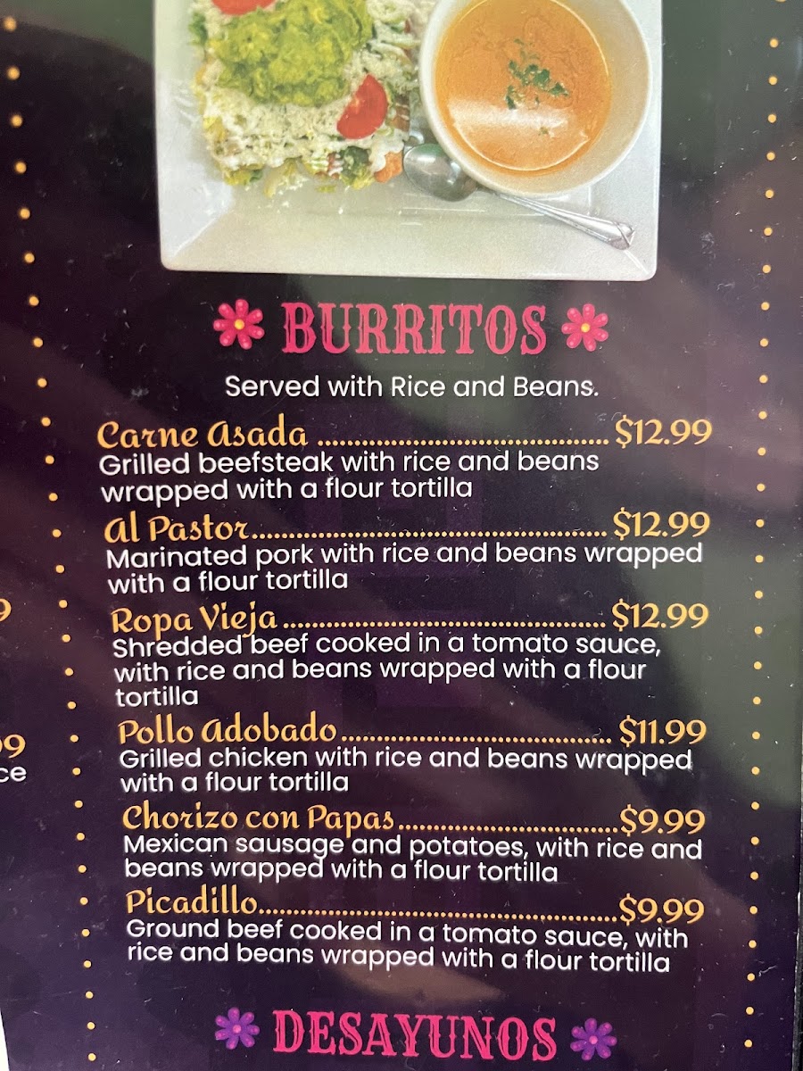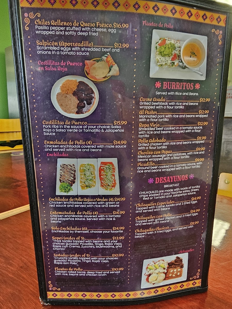 servido con arroz, frijol, o papas fritas/ Serve with rice, beans, or French fries incluye agua fresca pequeña o jugo /includes a small agua Fresca or juice