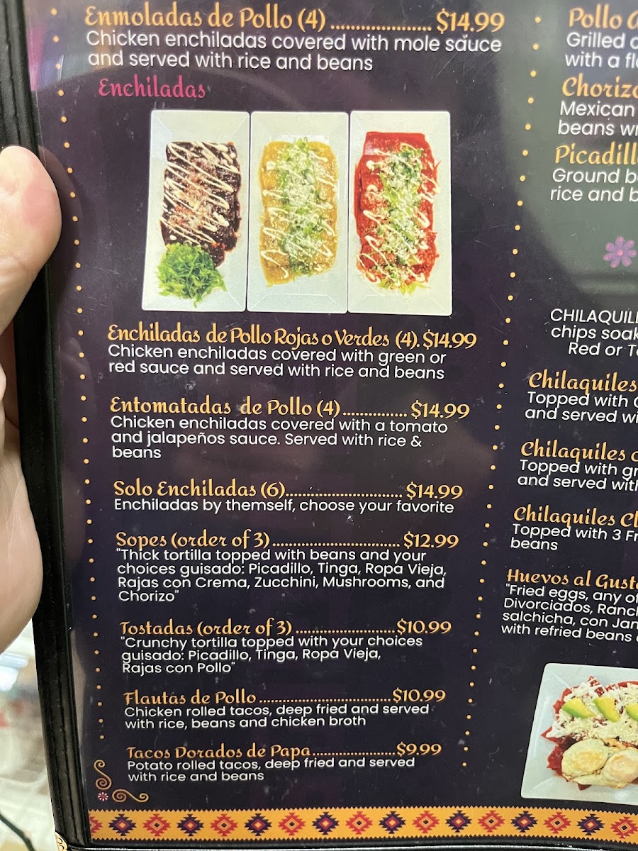 Salsa verde, salsa roja, mole o solo enchiladas (4). / Green salsa, red salsa, mole, Entomatada.(4). serve with rice & beans